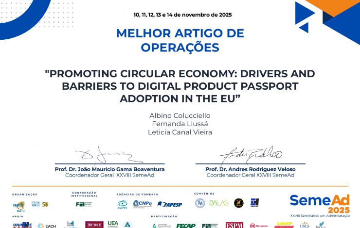 A Professora Fernanda Llussá foi distinguida no SemeAd XVIII com o prémio de melhor artigo em Operações e uma menção honrosa geral pelo estudo sobre os fatores que influenciam a adoção do Passaporte Digital do Produto na União Europeia.